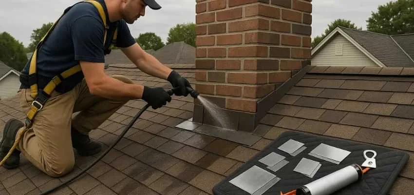 We examine crown slope, cap fit, mortar joints, brick or stone surfaces, and flashing transitions at the roofline. In Siloam, Uxbridge this area is often the origin of leaks.